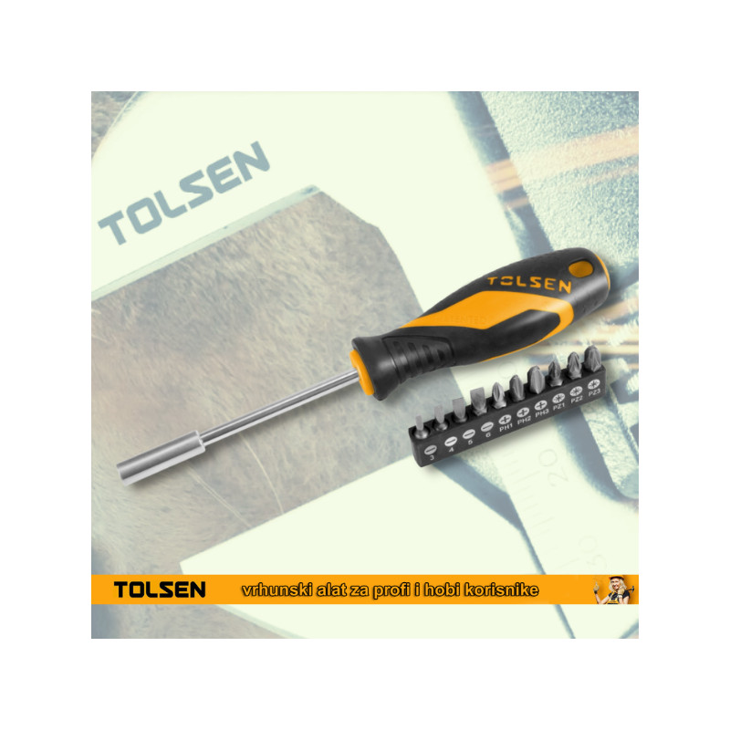 1 kom Rukohvat - odvijač sa adapterom 1/4″ x 100mm10 kom CrV bitova: 1/4″ x 25mmSL4, SL5, SL6PH1, PH2, PH3PZ1, PZ2, PZ3